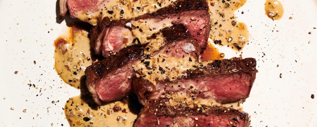 Steak au Poivre Recipe By: Dave Mathews Serving Size: 4 Preparation Time: 15 minutes Total Time: 2 1/2 hours Source: Cook this Book by Molly Baz